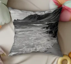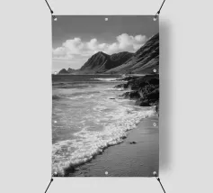Scoprite la bellezza drammatica della costa nord di Oahu con questa immagine che cattura una spiaggia incontaminata, onde potenti e montagne maestose sotto un cielo parzialmente nuvoloso.