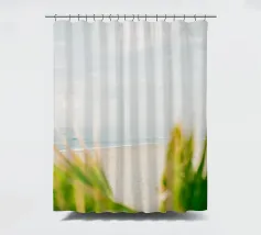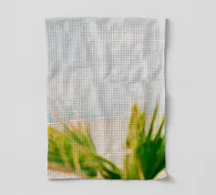 Spiaggia di sabbia chiara a Creta con vista sul mare e una palma leggermente sfocata in primo piano. La luce soffusa e i colori delicati catturano perfettamente l'atmosfera rilassata di una giornata estiva greca.