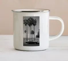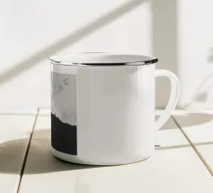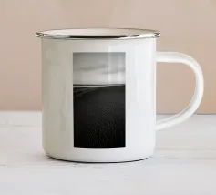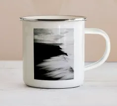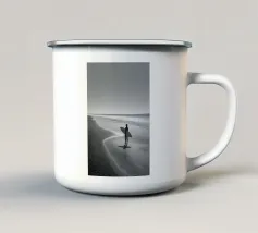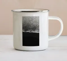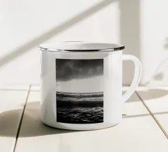 La costa con questa suggestiva opera d'arte in bianco e nero, caratterizzata da dolci onde che incontrano una costa scura e riflettente sotto un cielo morbido e nebbioso. Perfetto per un'estetica minimalista o moderna.