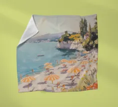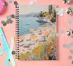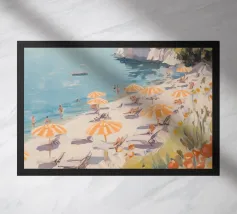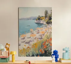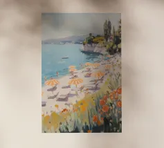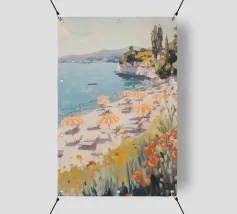 Tranquilla scena di spiaggia con ombrelloni a strisce bianche e arancioni, sedie a sdraio, mare turchese e fiori colorati, che immortala una rilassante giornata estiva.