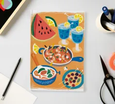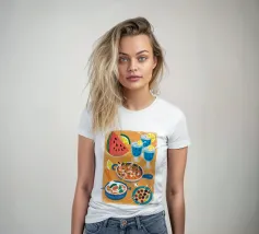 Vista dall'alto di un delizioso piatto estivo, con pizza ai frutti di mare, anguria e bevande fresche. La composizione è una rappresentazione vibrante, appetitosa e perfetta di un banchetto estivo in riva al mare.