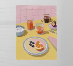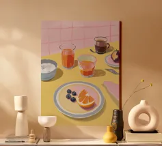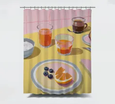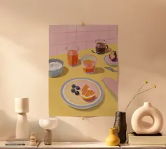 Uova, pane tostato, frutta e marmellata giacciono pacificamente su piatti di lavanda in una scena mattutina da sogno.