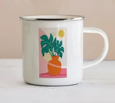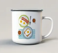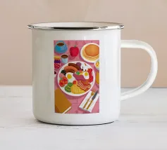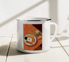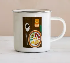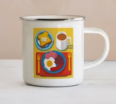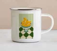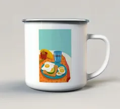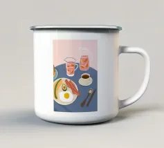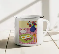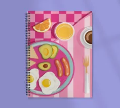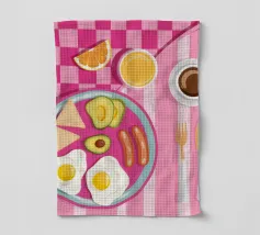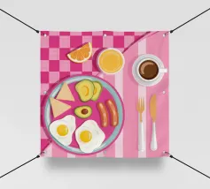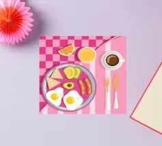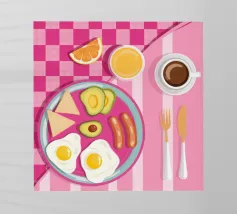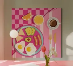 Vista dall'alto verso il basso di un piatto da colazione colorato con uova, olive e fette d'arancia, su uno sfondo a scacchi bianchi e rosa con una tazza di caffè.