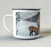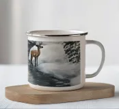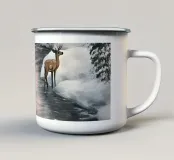 Una suggestiva immagine invernale con due cervi in piedi su un ruscello ghiacciato tra abeti innevati. I colori tenui del cielo e la tranquillità della foresta creano un'atmosfera pacifica e quasi magica. Quest'opera d'arte combina armoniosamente natura, fauna selvatica e magia invernale. Ideale come poster di renne, murale di cervi, arte murale natalizia, stampa di paesaggi invernali, motivo animale, idea regalo e decorazione domestica per la stagione fredda.