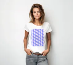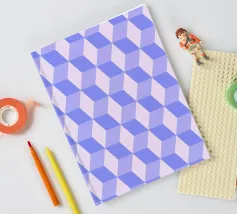 Accattivante stampa geometrica con una tassellatura di rombi che crea un cubo 3D o un'illusione spaziale di grande effetto, resa nei toni del viola chiaro/lavanda. La ripetizione delle forme geometriche crea questo irresistibile effetto ottico. File artistico digitale di alta qualità (7000x5000px, 300 dpi) perfetto per stampe di grande effetto. Ideale per una moderna arte astratta da parete.