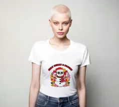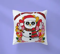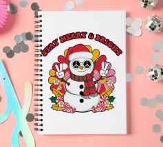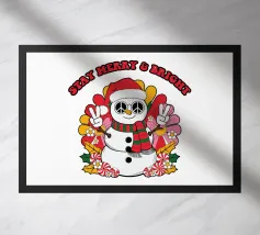 Un allegro pupazzo di neve indossa un cappello da Babbo Natale e una sciarpa a righe, facendo segni di pace con entrambe le mani. Circondato da fiori colorati, la frase "Stay Merry & Bright" si innalza sopra.
