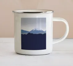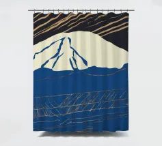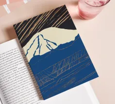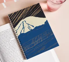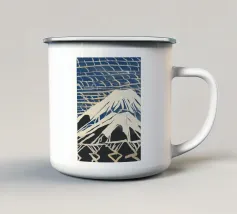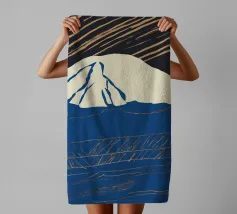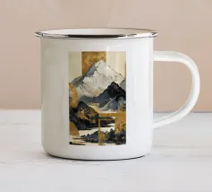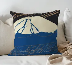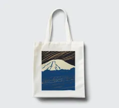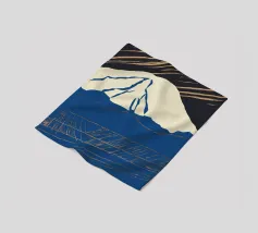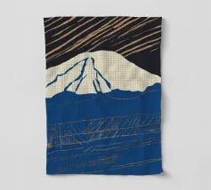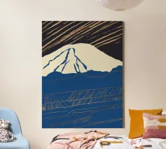 Un paesaggio stilizzato è caratterizzato da linee e forme astratte e audaci, che ritraggono una montagna innevata contro un cielo scuro. L'uso di colori contrastanti enfatizza la forma della montagna e le creste circostanti, creando un effetto drammatico.
