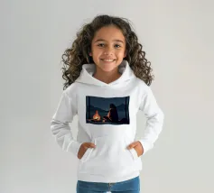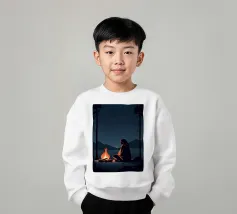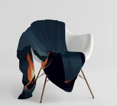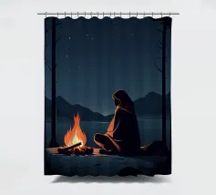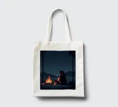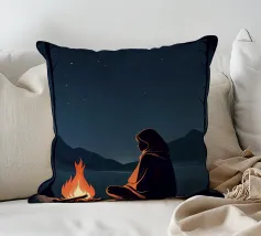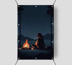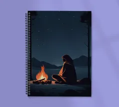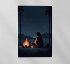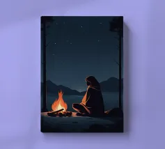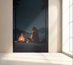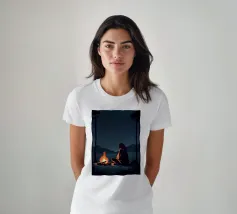 Una rilassante scena notturna di una donna seduta accanto a un falò incandescente sotto un cielo pieno di stelle. L'ambientazione pacifica e selvaggia cattura la solitudine, la riflessione e la bellezza delle notti tranquille all'aperto.
