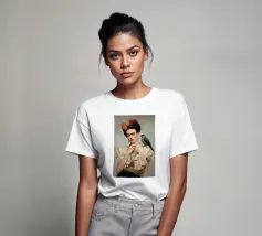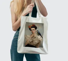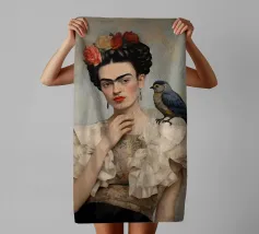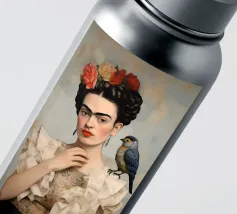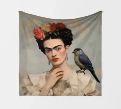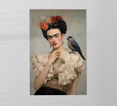 Il murale di moda mostra Frida Kahlo in stile boho con un uccello sulla spalla, circondata da motivi floreali e colori tenui della terra.