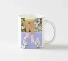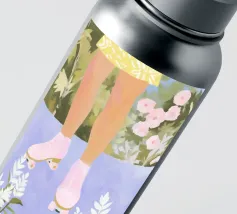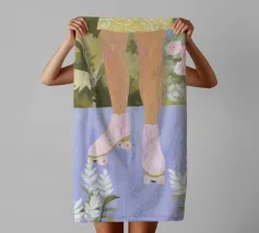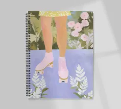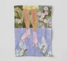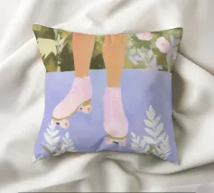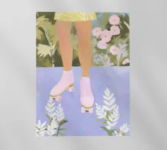 In delicati colori pastello, gambe di ragazze danzano su pattini a rotelle in un campo estivo botanico in fiore. Circondate da fiori rosa. Questa stampa d'arte acquerellata cattura perfettamente l'allegria giovanile e lo spirito estivo.
