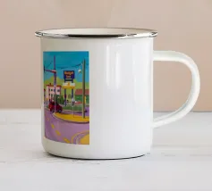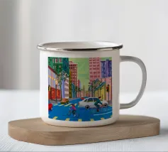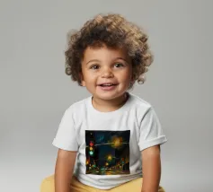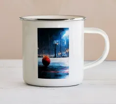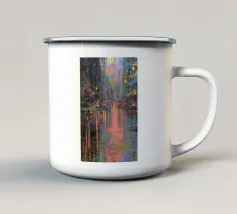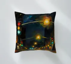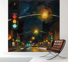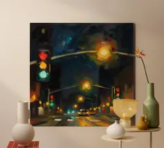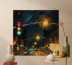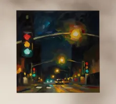 Questo dipinto a olio non raffigura solo un semaforo, ma cattura il vibrante impulso della città di notte.
