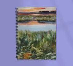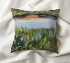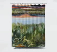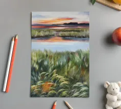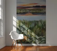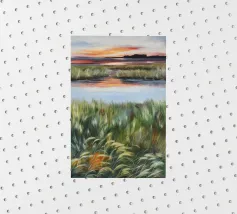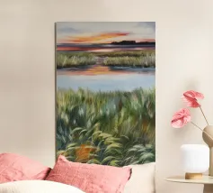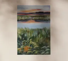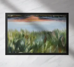 Erbe rigogliose e strati d'acqua si estendono in un morbido orizzonte di arancione e blu. Una composizione serena del dolce caos della natura.