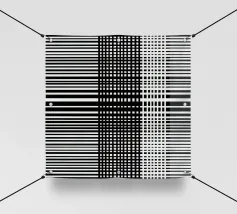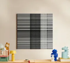 Un capolavoro senza tempo della Op Art: strisce orizzontali, quadri e motivi a griglia in bianco e nero puro si fondono e creano illusioni ottiche pulsanti - le linee sembrano vibrare, le superfici ondeggiare e l'occhio danza. Lo stile è quello della classica Op Art degli anni Sessanta, fortemente influenzata dalle dinamiche opere a righe di Bridget Riley, dalle illusioni geometriche di Victor Vasarely e dalla precisione minimalista del Bauhaus. L'effetto è affascinante e intenso: sfida l'occhio, calma e rivitalizza allo stesso tempo. Magiche vibrazioni positive sulla vostra parete!