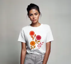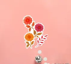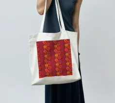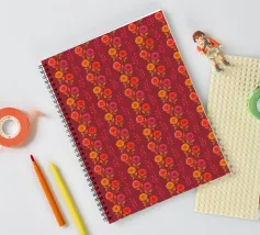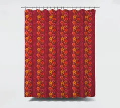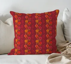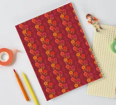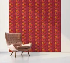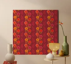 Stupende strisce floreali in stile cottagecore, con fiori di dalia bordeaux e arancione e rami e foglie rossi su sfondo bordeaux.
