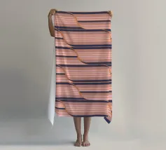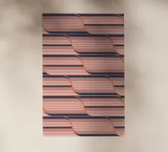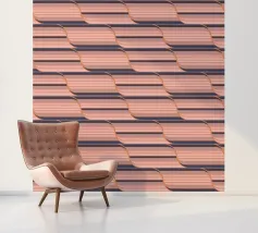 Elegante motivo geometrico a righe di ispirazione rétro, con strisce sfumate in blu marino, tortora e rosa arancione e linee ondulate in arancione.
