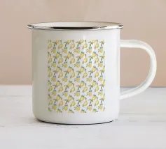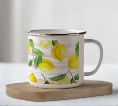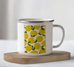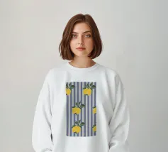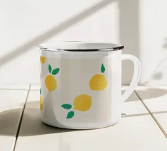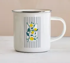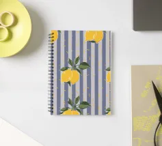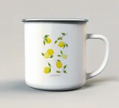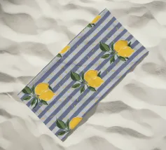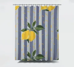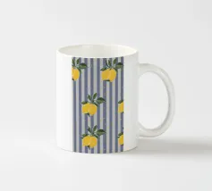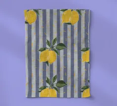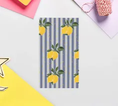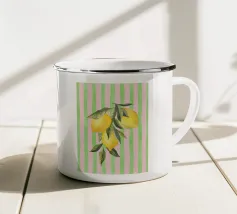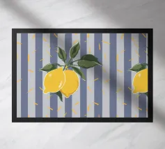 Una bella natura morta di un ramo di limoni in un vaso, su uno sfondo a strisce verticali bianche e blu. La composizione è fresca e classica, con un'atmosfera mediterranea e pulita.