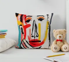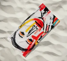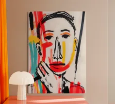 Un ritratto astratto che crea tensione con audaci pennellate di colore e linee nette: pennellate rosse, gialle e turchesi incontrano un volto ridotto in bianco e nero che appare distante ed espressivo allo stesso tempo. La composizione è in equilibrio tra rappresentazione figurativa e gesto spontaneo: un'opera piena di energia e carattere che rivitalizza immediatamente gli interni moderni.