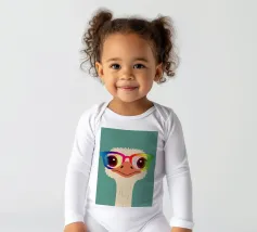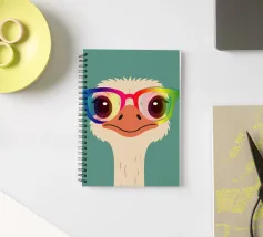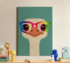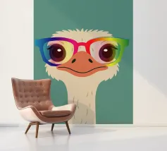 Uno struzzo elegante con uno sguardo sfrontato e occhiali colorati. Un ritratto originale di animale pieno di colore, individualità e umorismo, perfetto per progetti creativi e di carattere.