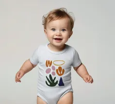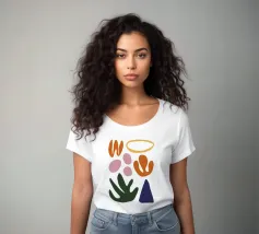 Una composizione astratta minimalista di varie forme organiche in terracotta, blu e nero, che fluttuano su uno sfondo bianco, creando un senso di luce ed equilibrio.