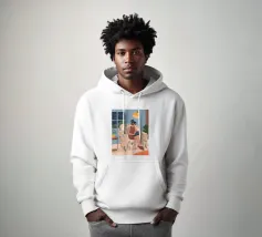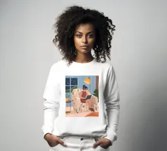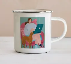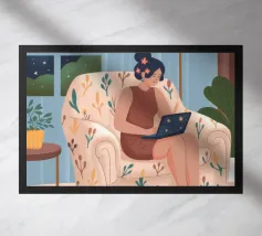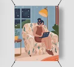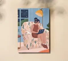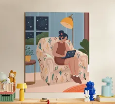 Una persona è seduta su una comoda sedia con un computer portatile sulle ginocchia, mentre lavora o studia. La stanza è illuminata in modo soffuso da una lampada, ci sono piante e un tavolino con una tazza di tè o caffè, creando un ambiente accogliente e produttivo.