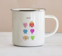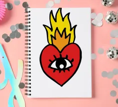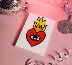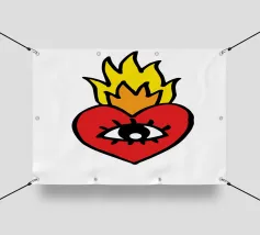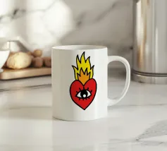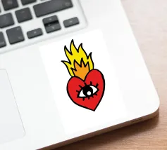 Un cuore rosso stilizzato presenta un occhio al centro, sormontato da vivaci fiamme gialle e arancioni. I contorni neri e decisi aggiungono un contrasto sorprendente all'immaginario simbolico e fiammeggiante.