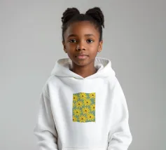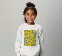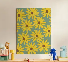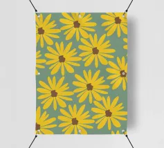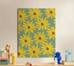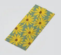 Fiori gialli brillanti con centri marroni sono disposti a ripetizione su uno sfondo verde tenue. Il design semplice e deciso conferisce un aspetto allegro e vivace.