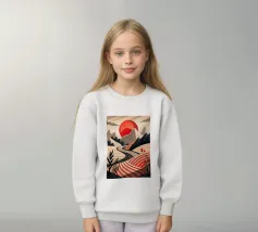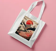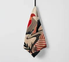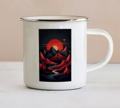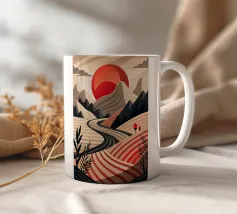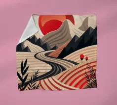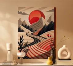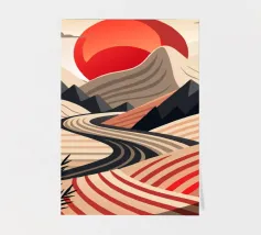 Un dipinto paesaggistico vibrante e minimalista che raffigura una strada tortuosa che conduce verso una maestosa catena montuosa immersa nel caldo bagliore del sole al tramonto.