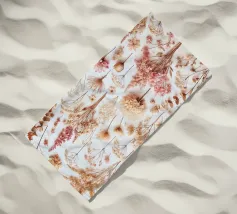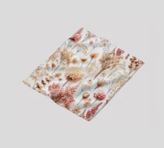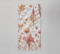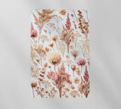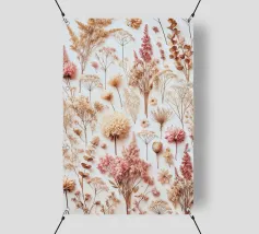 Una delicata composizione di fiori secchi, diversi per consistenza e forma, su uno sfondo morbido color crema che degrada sottilmente verso un beige chiaro, con accenni di sfumature calde e terrose, che evocano un senso di eleganza rustica, I fiori stessi vantano una tavolozza calda e tenue di gialli dorati, lavanda polverosi e rosa sbiaditi, i cui petali sono arricciati e vaporosi, come se sussurrassero di una stagione passata; ogni fiore è imperfetto in modo unico, ma armoniosamente disposto per creare una natura morta di grande impatto visivo e sognante che emana un senso di malinconica nostalgia.