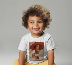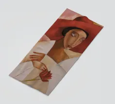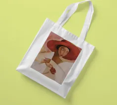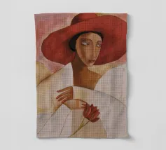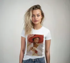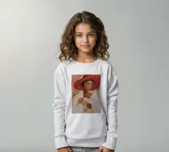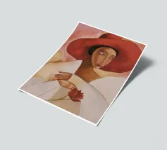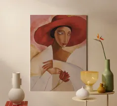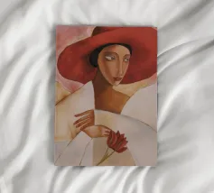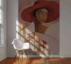 Una donna vestita di bianco tenue tiene in mano un fiore delicato, il suo grande cappello e il suo sguardo sono pieni di silenzioso mistero.