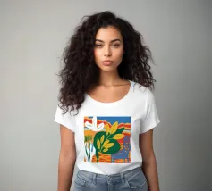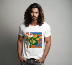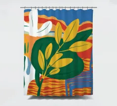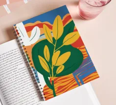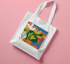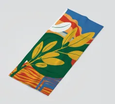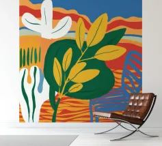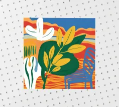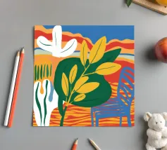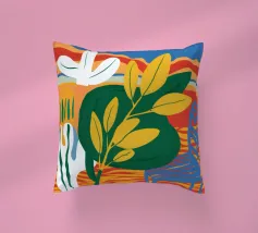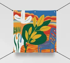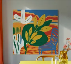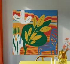 Una vivace natura morta con grandi foglie gialle e verdi in un vaso a motivi blu, su uno sfondo rosso e blu.