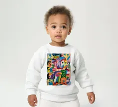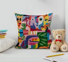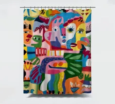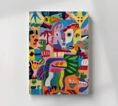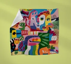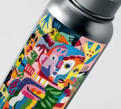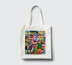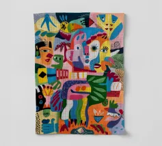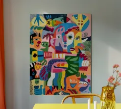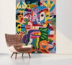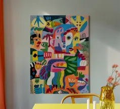 Un gruppo di figure umane stilizzate disposte in un ambiente dinamico e colorato. I tratti esagerati e i motivi geometrici evocano movimento ed energia.