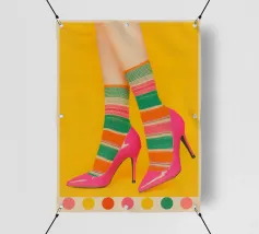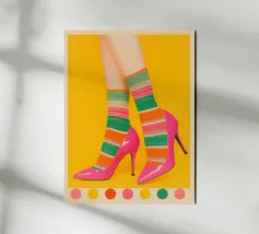 Quest'opera d'arte colorata presenta tacchi alti rosa abbinati a pois colorati e calzini a righe che incarnano un moderno look retrò degli anni 70-80. Lo sfondo giallo brillante e i colori vivaci evidenziano perfettamente la moda giocosa: una dichiarazione per ogni casa attenta alle tendenze.