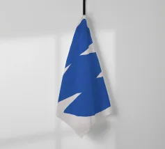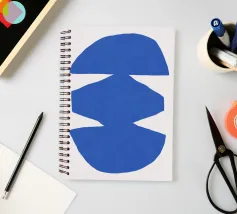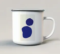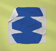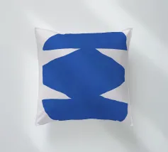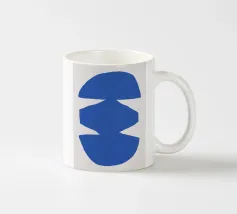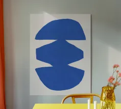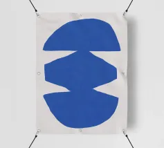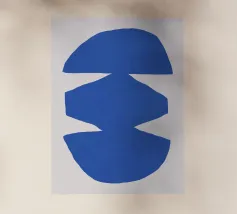 Una serie di forme astratte e audaci di colore blu sono disposte verticalmente su uno sfondo bianco, creando un disegno simmetrico. La composizione evoca un senso di equilibrio e semplicità attraverso le sue forme geometriche.