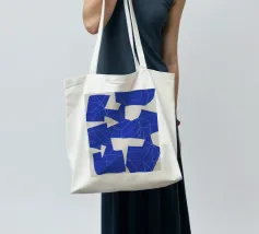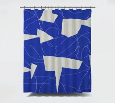 Forme astratte blu sono disposte su uno sfondo chiaro, intersecate da delicate linee bianche. La composizione forma un intricato motivo geometrico con un senso di movimento.