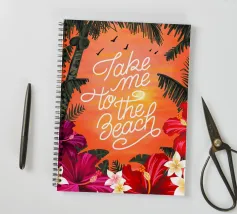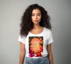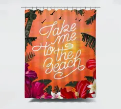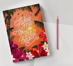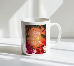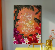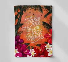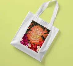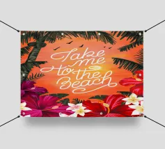 Illustrazione del tramonto con scritte, palme e fiori di ibisco