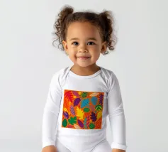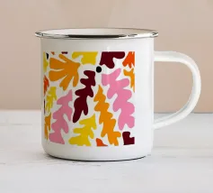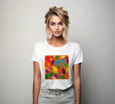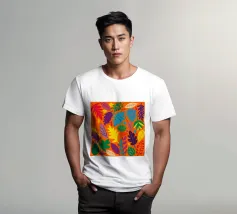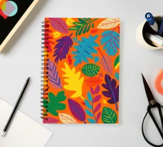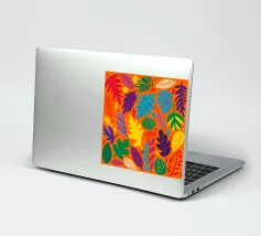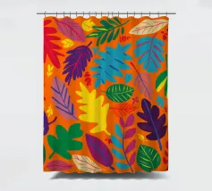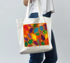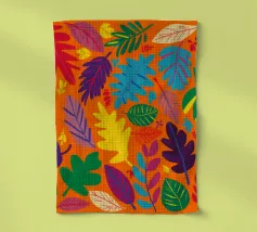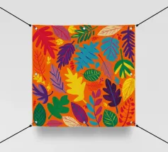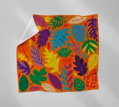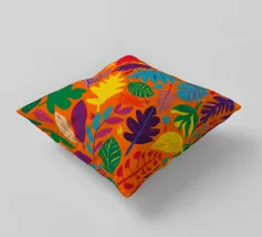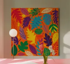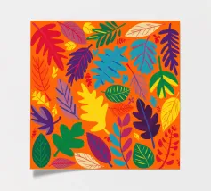 Un fitto e intricato disegno di foglie tropicali in una tavolozza calda e vibrante dominata dall'arancione e dal giallo, con accenti di blu e verde freddo.