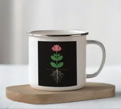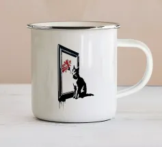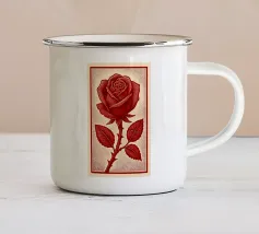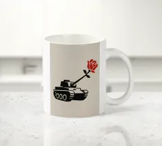 La silhouette nera di un carro armato è raffigurata con una rosa rossa che emerge dalla canna del cannone. Il contrasto tra la macchina da guerra e il delicato fiore simboleggia la pace che prevale sul conflitto.