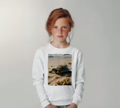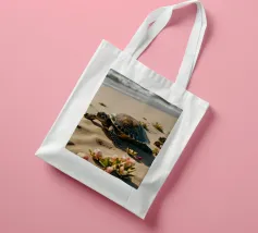 Due tartarughe strisciano sulla sabbia soffice verso l'oceano, circondate da fiori colorati in una luminosa giornata di sole. Le dolci onde sono visibili sullo sfondo.