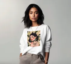 Questa opera d'arte mostra una persona con capelli corti e neri, che indossa orecchini verdi e un tatuaggio a forma di farfalla sulla schiena. Lo sfondo è caratterizzato da grandi foglie verdi, che aggiungono un'atmosfera serena e naturale alla composizione.