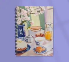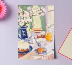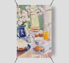 Una serena scena di colazione con un tavolo adornato da un vaso floreale blu, fiori freschi, succo d'arancia, pancake ed eleganti stoviglie immerse nella luce naturale. Perfetto per ispirare arte e stile di vita.