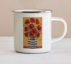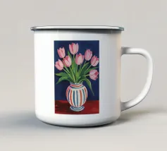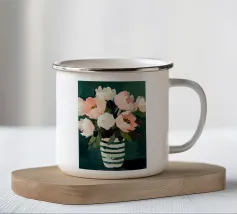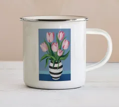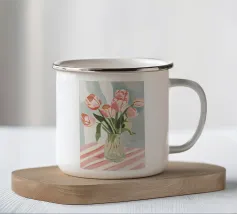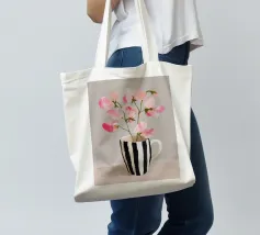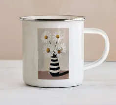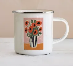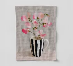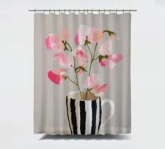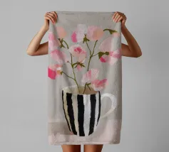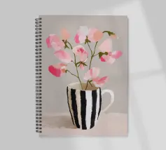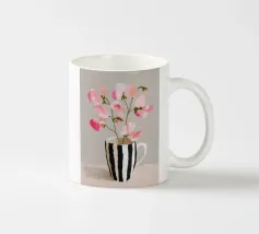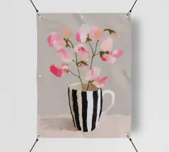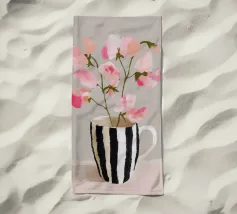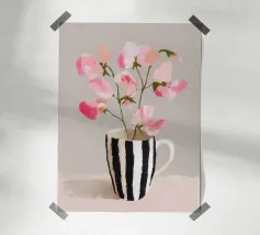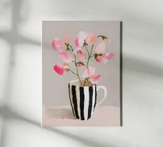 Questa illustrazione minimalista mostra un'elegante tazza di ceramica a righe bianche e nere, circondata da fiori rosa e foglie verdi. Sullo sfondo beige, l'allegro bouquet di fiori irradia leggerezza estiva e porta la freschezza botanica in ogni stanza!