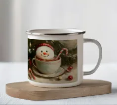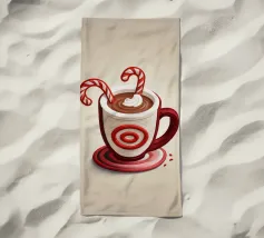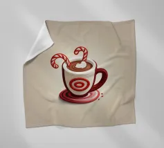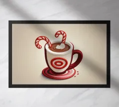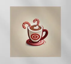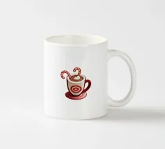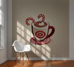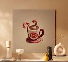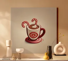 Una grafica colorata presenta una tazza stilizzata piena di ricca cioccolata calda, sormontata da panna montata e bastoncini di zucchero, posta su un sottobicchiere circolare.