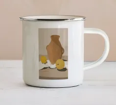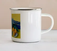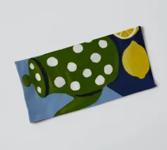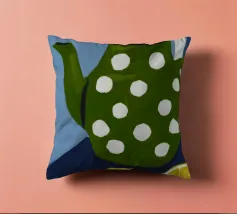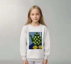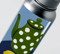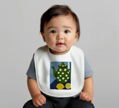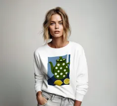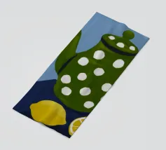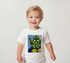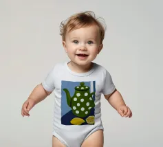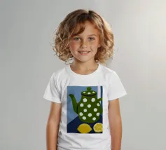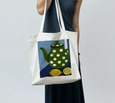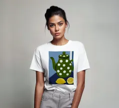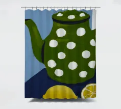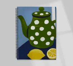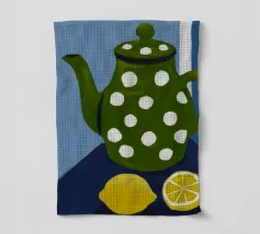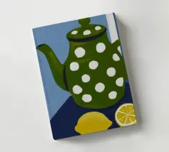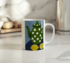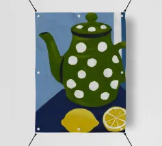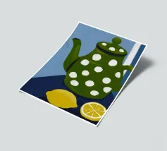 Una stravagante natura morta di una teiera verde a pois bianchi, accanto a un limone a fette su un tavolo blu. La composizione è giocosa e affascinante, con un'atmosfera divertente da cucina retrò.