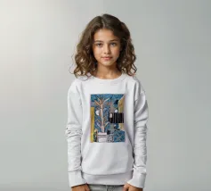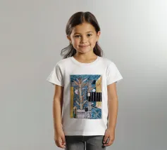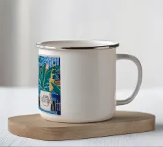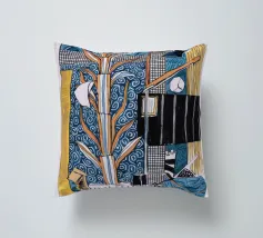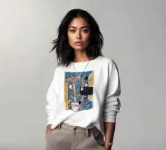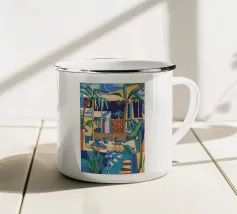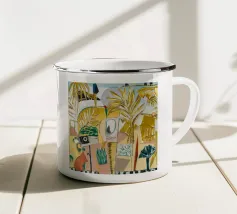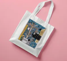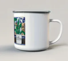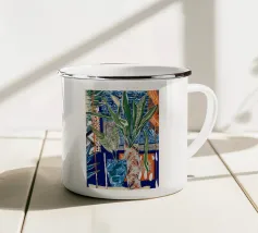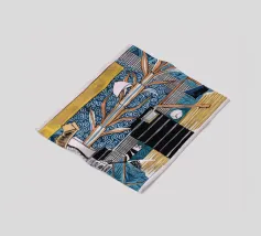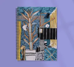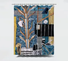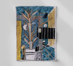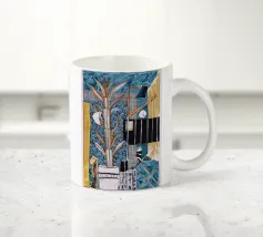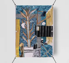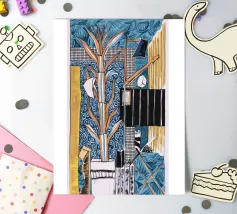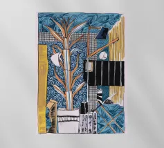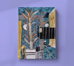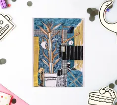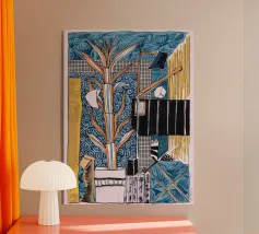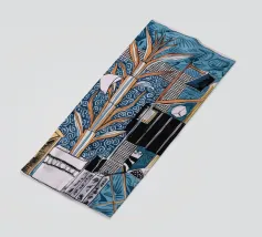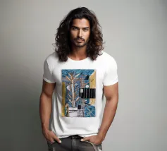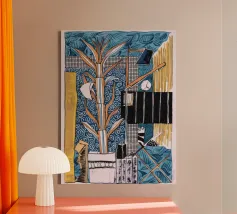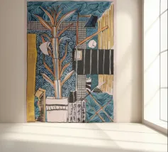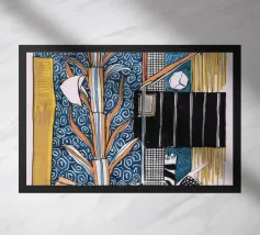 Questa opera d'arte raffigura un fogliame tropicale con elementi astratti. L'uso di colori vivaci come il verde, il blu e il giallo, insieme a motivi intricati, crea una scena vivace ed energica.