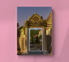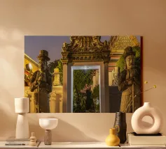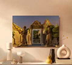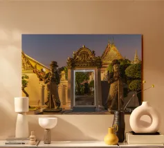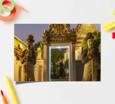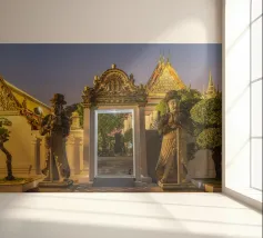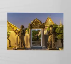 Statue giganti della Guardia Farang all'ingresso del complesso di templi buddisti Wat Pho al tramonto, Bangkok, Thailandia, Asia | Statue giganti della Guardia Farang all'ingresso del complesso di templi buddisti Wat Pho al tramonto, Bangkok, Thailandia, Asia