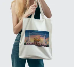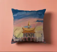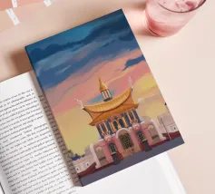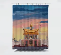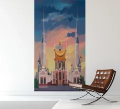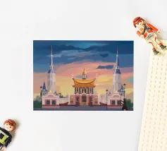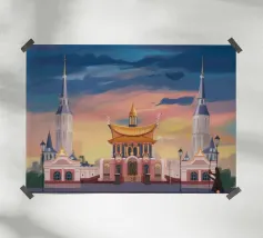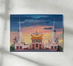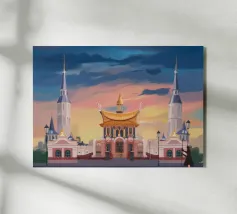 Un tempio o un palazzo asiatico tradizionale e decorato è splendidamente illuminato da un cielo crepuscolare viola e arancione, creando una scena di serena maestosità.