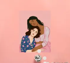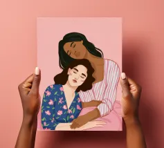 Un ritratto toccante e intimo di due donne in un abbraccio affettuoso, reso con uno stile illustrativo morbido che enfatizza il legame e la tenerezza.