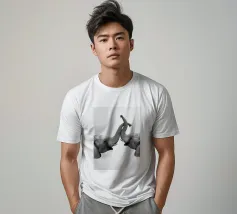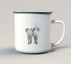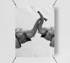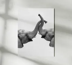 Questa illustrazione minimalista mostra due elefanti in un abbraccio affettuoso, con le proboscidi delicatamente intrecciate. In bianco e nero, il disegno esprime il legame e l'affetto tra gli animali, perfetto per gli amanti degli animali.
