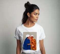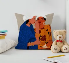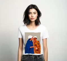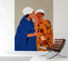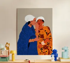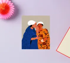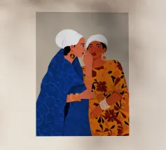 Un ritratto tenero e affettuoso di due donne, forse madre e figlia o due amiche intime, che condividono un abbraccio caldo e affettuoso.