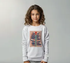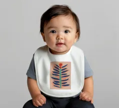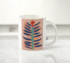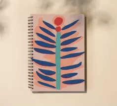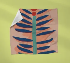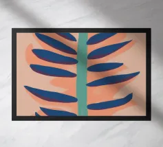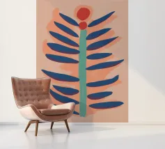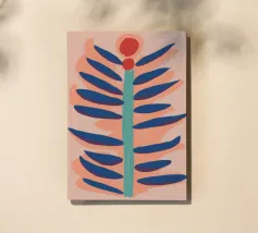 Una rappresentazione astratta e stilizzata di una pianta dalle grandi foglie, realizzata con una tavolozza calda di terracotta, rosa e blu intenso. La composizione verticale e le forme decise le conferiscono un fascino moderno e decorativo.